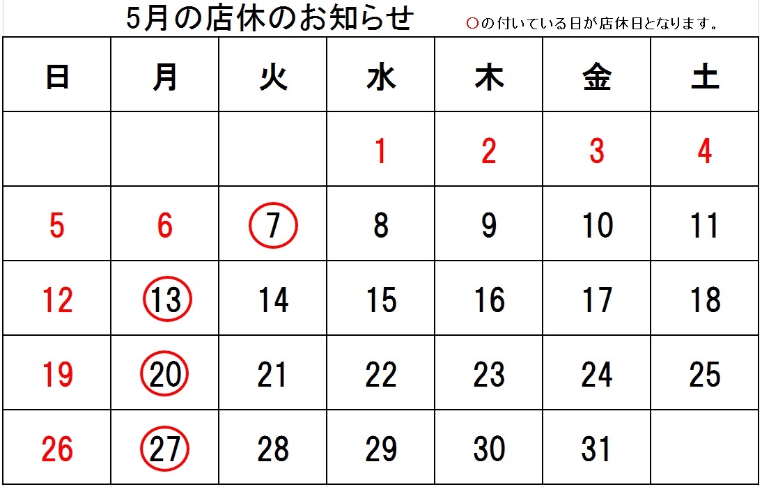 2019年5月定休日